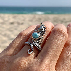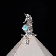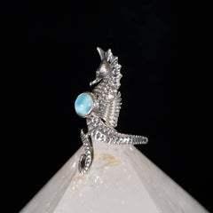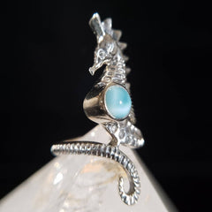 Features a round shaped natural and untreated Larimar crystal. The sterling silver Seahorse design wraps around your finger just like how seahorses do under water when they hold onto seaweed!